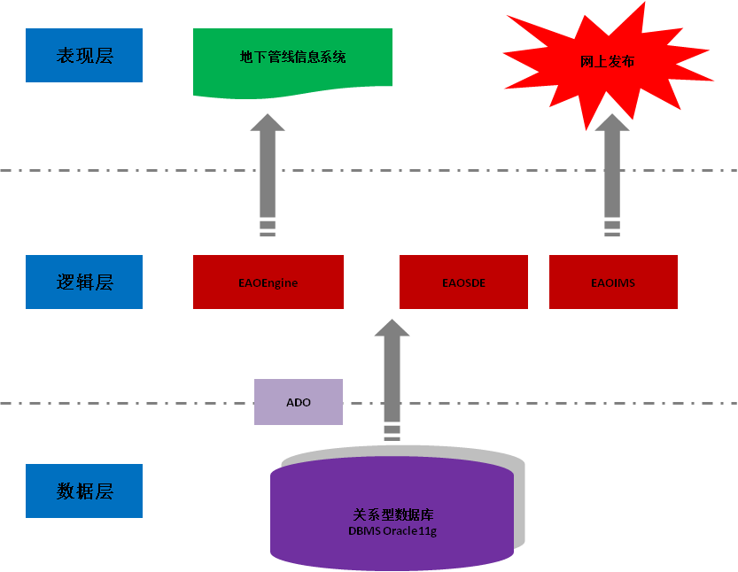 | 逻辑层:采用EAOGIS产品系列中EAOGIS Engine组件接口和EAOIMS网络服务器,通过EAOSDE空间数据引擎,负责数据库系统业务逻辑的实现,如空间数据的存取、表现和操作等 | |