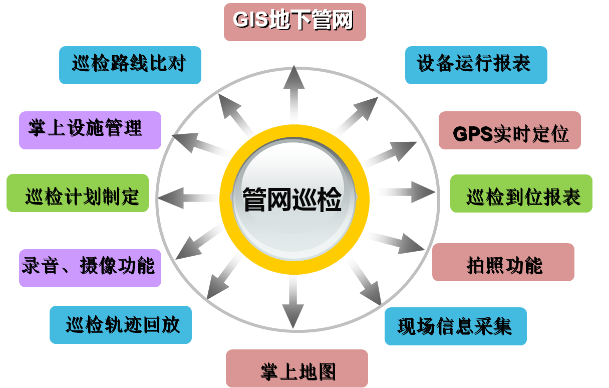 | 1 | 采用了GPS型PDA手机作为手持终端,内置用户端软件,可查询管线和设施信息,巡检计划,记录管线故障和设备状态、参数,并支持拍照 |